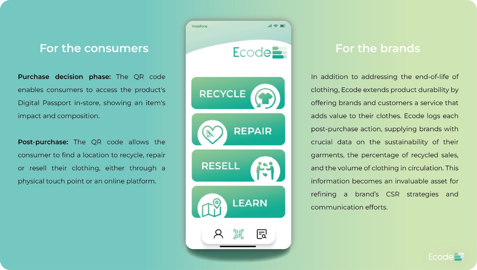 This solution is designed to transform consumption patterns to be sustainable, responsible, and circular. Ecode unifies the entire landscape of stakeholders in circularity by connecting brands, consumers, recyclers, repairers, and resellers. This integration enables us to track and assess the condition of clothing throughout its lifecycle.